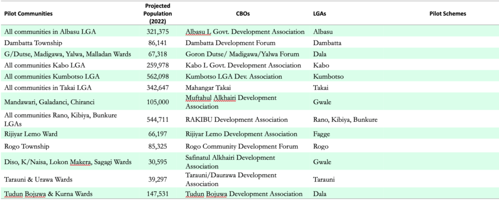Kano State with a projected population of 16 million (2022), has 44 local government areas with delineated 484 electoral wards and 9,108 communities. The State has registered some Community Based Associations (CBOs) who are active in various community development projects in their domains. The CDS has identified 13 of such CBOs as partners representing a total of approximately 2.7 million people. Each association will introduce specific CDS pilot schemes in respective communities. View the table below for the pilot Communities and engaged CBOs.